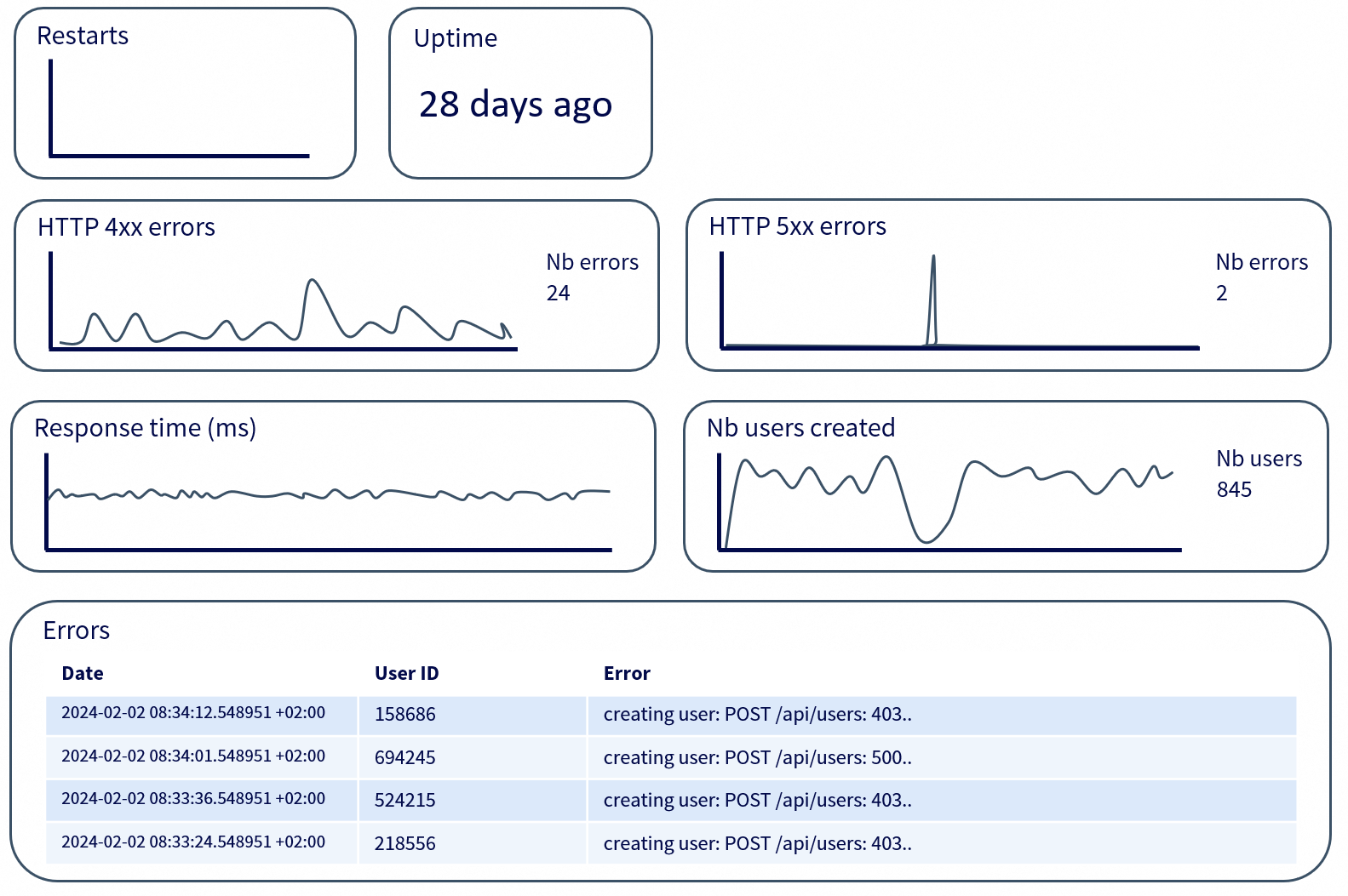 This is a classic illustration of what a microservice monitoring dashboard might look like, but dashboards can be made for an infinite number of other needs.
